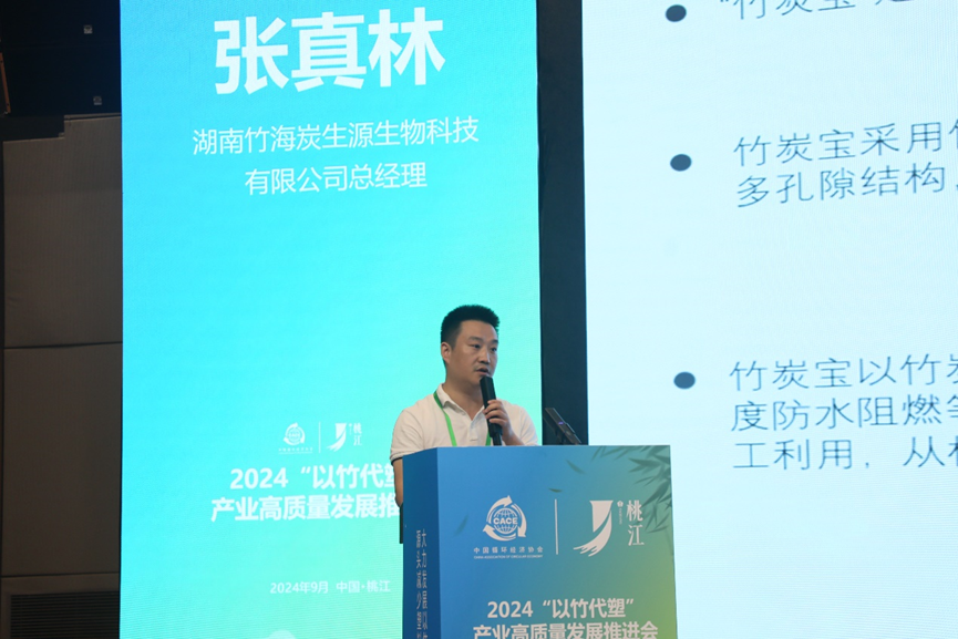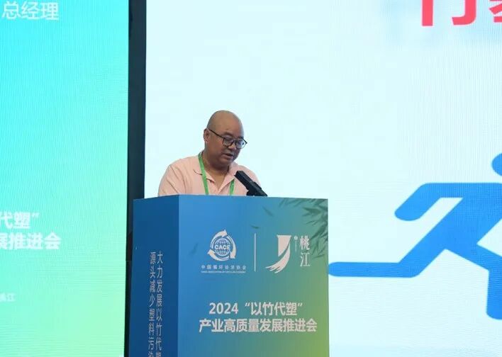 图15 广宁县对外招商组副组长祝健彬作经验交流发言在会议发布环节,中国循环经济协会“以竹代塑”标准化工作组主任委员傅金和发布了首批3个“以竹代塑”团体标准,申贵仓发布了《“以竹代塑”发展报告2024》,桃江高新区工委书记夏薇发布了桃江县人民政府“以竹代塑”招商需求,湖南和乐新材科技开发有限公司执行董事、总经理黄宗洪和长沙正忠科技发展有限公司董事长张立忠、湖南竹海炭生源生物科技有限公司总经理张真林及湖南桃花江竹材科技股份有限公司董事长、总经理薛志成分别发布了4项“以竹代塑”新技术新产品。