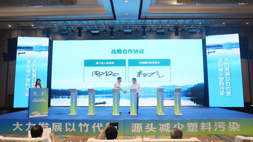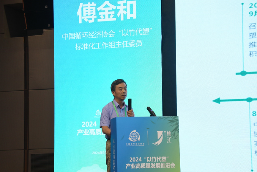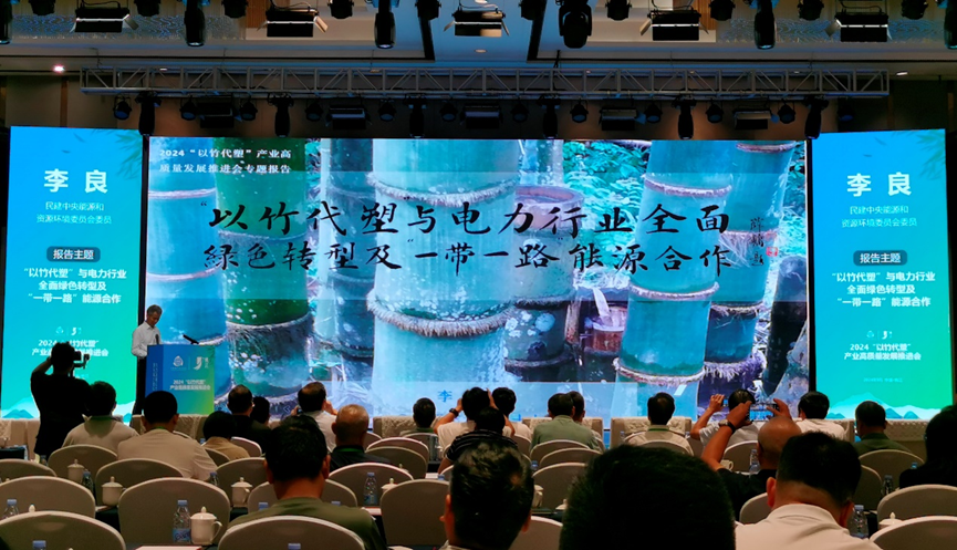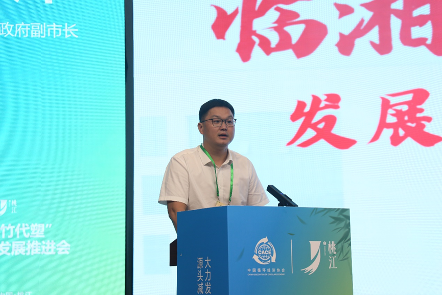 为贯彻习近平总书记向国际竹藤组织成立二十五周年志庆暨第二届世界竹藤大会致贺信中关于“以竹代塑”的有关精神,落实《加快“以竹代塑”发展三年行动计划》(发改环资〔2023〕1375号)相关要求,大力推动“以竹代塑”发展,2024年9月27日-29日,2024“以竹代塑”产业高质量发展推进会(以下简称会议)在湖南省益阳市桃江县隆重召开,会议的主题是“大力发展以竹代塑 源头减少塑料污染”。本次会议由中国循环经济协会主办,由中南林业科技大学、中国林学会竹子分会、湖南省循环经济研究会、湖南省竹产业协会、浙江省竹产业协会、江西省竹产业协会、《世界竹藤通讯》编辑部等9家机构共同协办,由桃江县人民政府具体承办。会议得到了中林绿碳(北京)科技有限公司、湖南桃花江竹材科技股份有限公司、北京竹事科技有限公司、秦皇岛天业通联重工科技有限公司、广州腾丰投资服务有限公司、广东创德新竹业有限公司的大力支持。来自国家发展改革委、商务部以及湖南省相关部门领导,中国工程院院士、中南林业科技大学党委书记吴义强等40多位“以竹代塑”领域专家学者,福建省、浙江省、湖南省、湖北省、江西省、贵州省、四川省、广东省、广西壮族自治区等省份的20个中国竹子之乡和中国特色竹乡地方政府代表,近120家“以竹代塑”供给端和应用端企业代表,及其他相关机构嘉宾共350余人参加了会议。