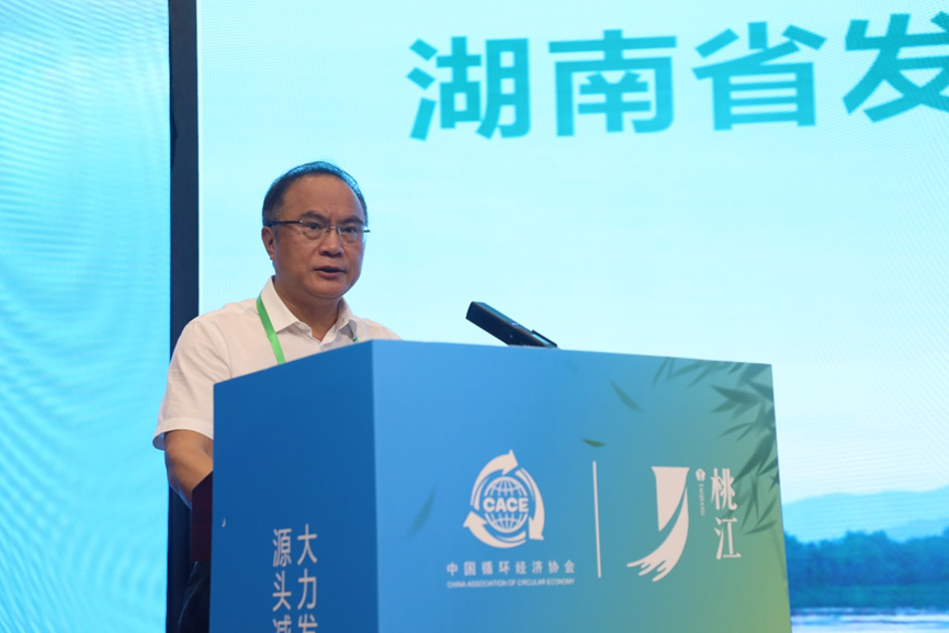 9月28日上午,会议共包含嘉宾致辞、领导讲话、院士报告、经验交流、会议发布和授牌签约等6个环节,分别由中国循环经济协会秘书长郭占强和中共桃江县委副书记、统战部部长冷亮主持。在嘉宾致辞环节,中共益阳市委常委、市人民政府副市长朱春光和湖南省发展改革委副主任杜中华、中国循环经济协会会长朱黎阳分别致辞。图4 中共益阳市委常委、市人民政府副市长朱春光致辞