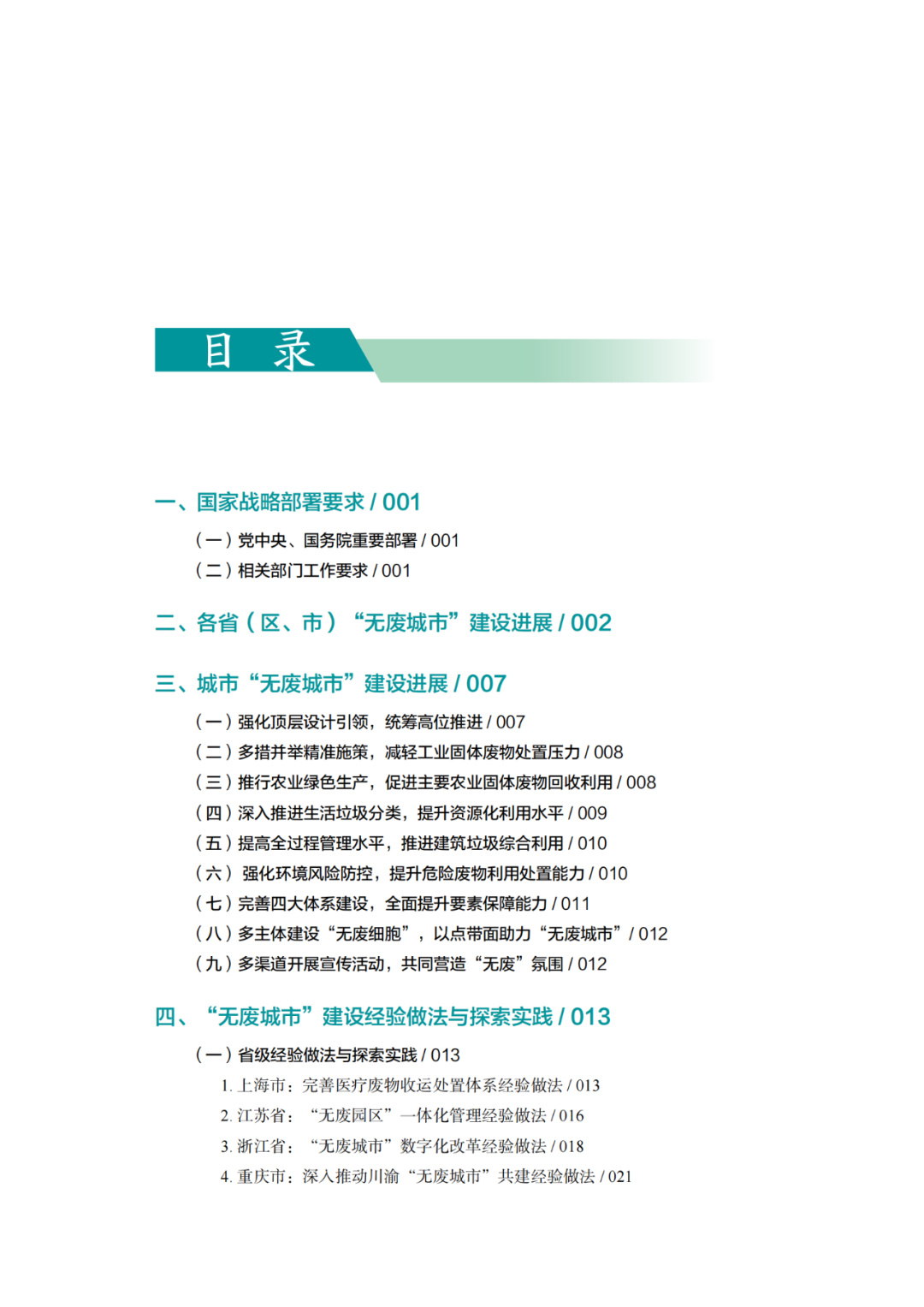 为高质量推进“十四五”时期“无废城市”建设,跟踪各地2023年“无废城市”建设的主要进展、经验做法和取得成效,在生态环境部固体废物与化学品司指导下,在各省(区、市)、各城市及地区生态环境部门的共同参与和支持下,生态环境部固体废物与化学品管理技术中心编制并发布《“无废城市”建设进展研究报告(2023年)》(以下简称《报告》)。党中央、国务院高度重视固体废物污染防治。推进“无废城市”建设,有助于引导全社会减少固体废物产生,推动城市加快形成节约资源和保护环境的空间格局、产业结构、生产方式、消费模式,提高城市绿色发展水平,不断改善城市生态环境质量,增强民生福祉。自《“十四五”时期“无废城市”建设工作方案》印发以来,全国“113+8”个城市和地区开展“无废城市”建设取得积极进展,但部分城市和地区仍面临问题和挑战,亟需跟踪整理各地“无废城市”建设的经验做法和取得成效,为地方推进“无废城市”建设和实践创新提供借鉴参考。《报告》主要内容包括4个部分。第一部分是国家战略部署要求,包括党中央国务院重要部署和相关部门工作要求。第二部分是各省(区、市)“无废城市”建设进展,梳理了工作成效显著的省级“无废城市”建设进展。第三部分是城市“无废城市”建设进展,包括体制机制创新、重点领域实践、保障能力提升、“无废文化”培育及宣传教育等方面的工作进展。第四部分是“无废城市”建设经验做法与探索实践,包括省级经验做法与探索实践、城市经验做法与探索实践和“无废细胞”建设三个方面。